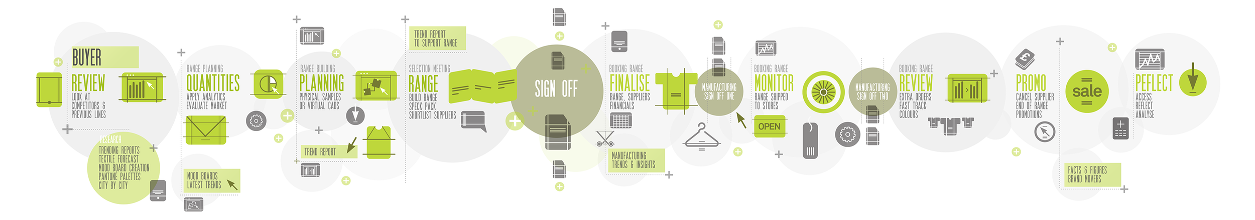 Based on the insights from my persona and customer journey research, I created a product concept that relied on big data optimization targeting buyers, merchandizers, marketeers and designers in the fashion industry. It provides a full range of product areas including lingerie, sleepwear, jewelry which I found to be underrepresented in comp shopper offerings in the competitor products. Some of the key highlighted in this prototype: